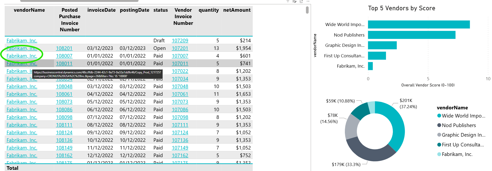 Using Drill Through - you can see the Fabrikam, Inc. Vendor Invoice details. It’s even possible to link from a report to a specific URL string. This enables End Users to navigate directly to a web page from your report.